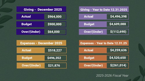 At Faith Bible, we’re committed to financial transparency. Each month, we share an overview of our recent giving and expenses. For a more detailed breakdown, don’t miss our